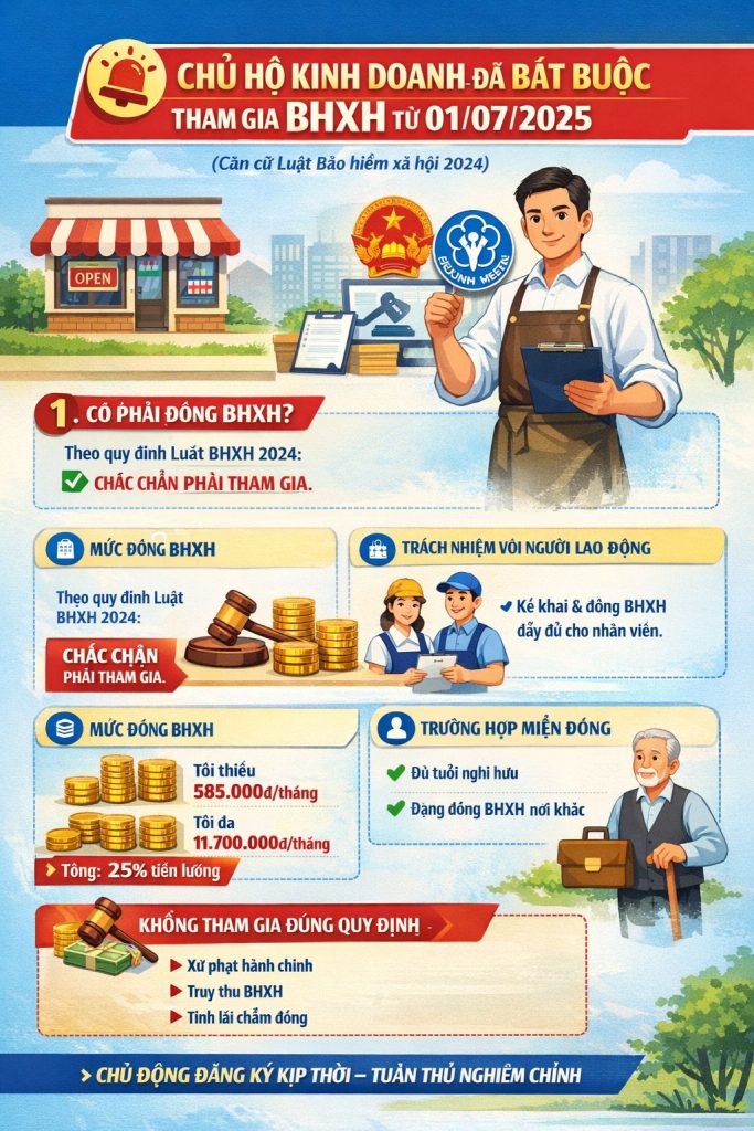 Từ ngày 01/07/2025, theo Luật Bảo hiểm xã hội 2024, chủ hộ kinh doanh có đăng ký kinh doanh chính thức thuộc đối tượng tham gia BHXH bắt buộc.