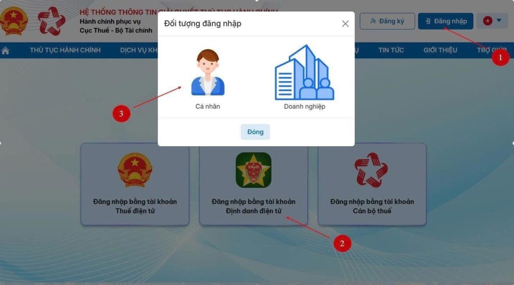 – B1: Truy cập vào trang dịch vụ công: https://dichvucong.gdt.gov.vn/tthc/homelogin ->chọn “Đăng nhập” -> “Đăng nhập bằng tài khoản VneID -> Chọn mục “Cá nhân”