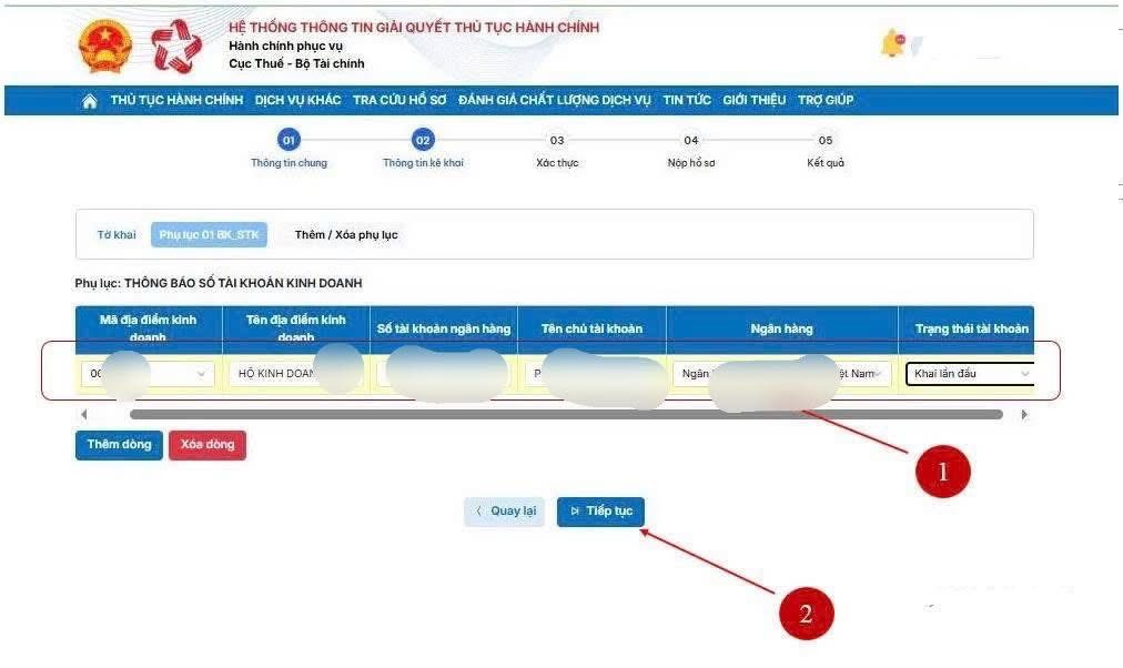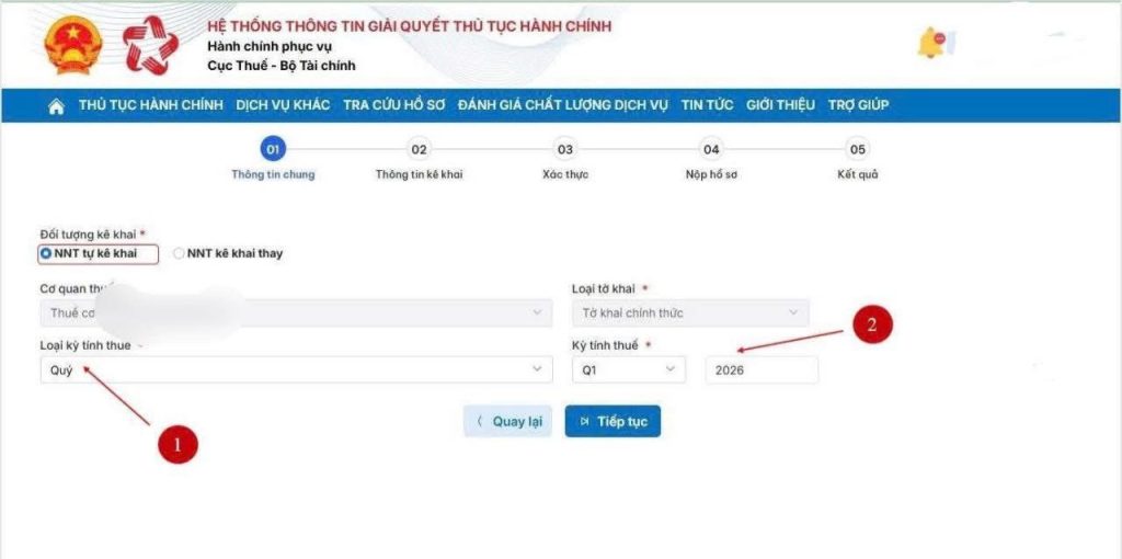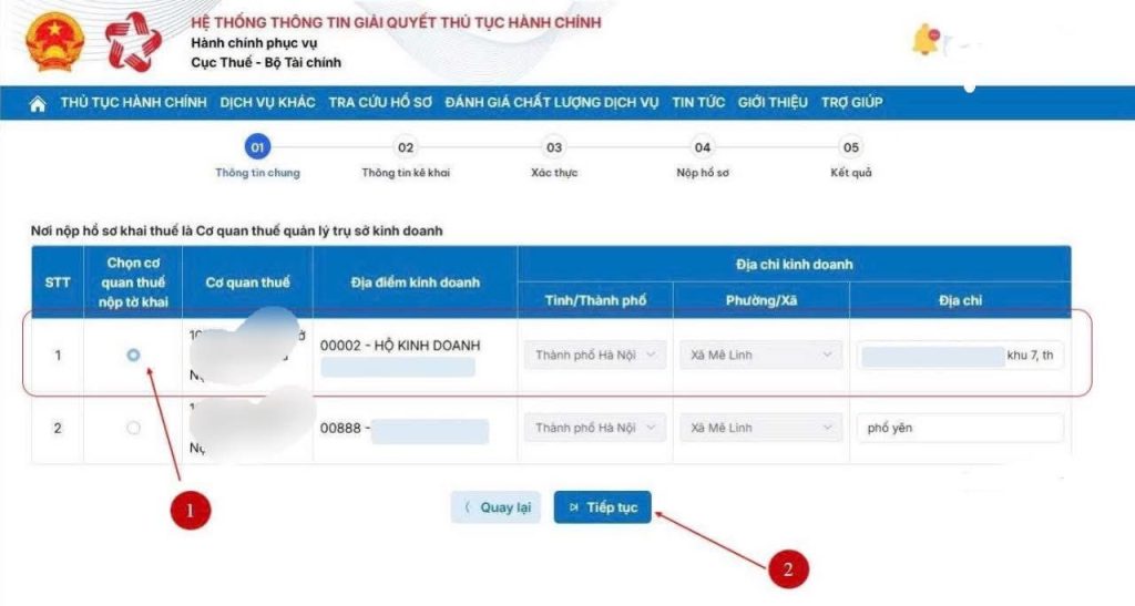 – B5: Chọn địa điểm kinh doanh, kỳ tính thuế -> “Tiếp tục”