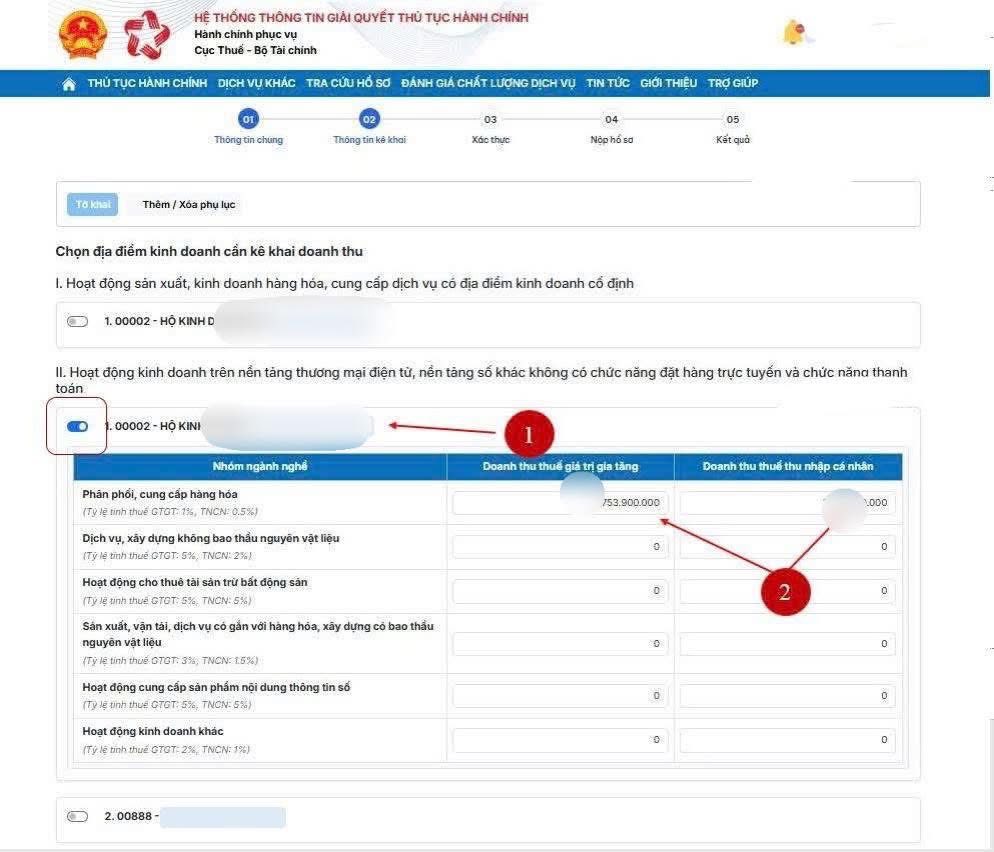 HKD có nhiều ngành nghề kinh doanh với các mức thuế khác nhau: chọn ngành nghề có doanh thu lớn nhất để điền giảm trừ 500 triệu, nếu chưa giảm trừ hết thì điền tiếp vào ngành còn lại.