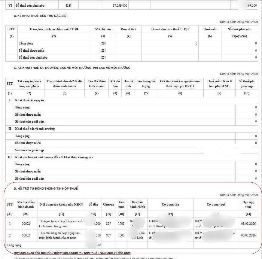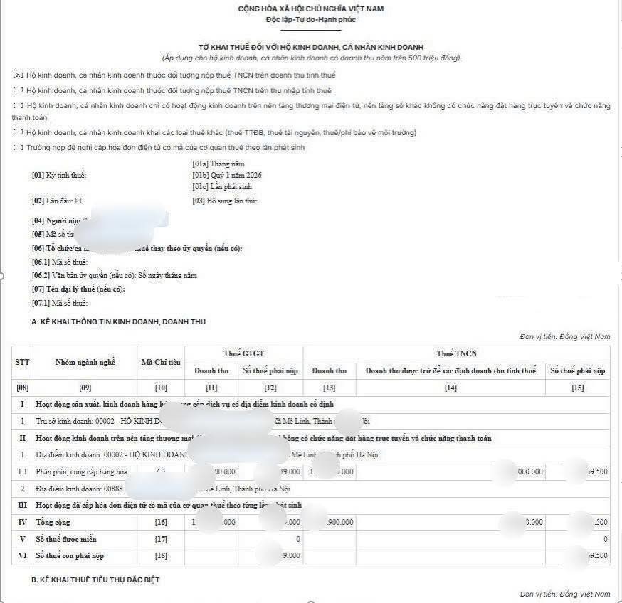 LƯU Ý: với cột doanh thu được trừ để xác định doanh thu tính thuế; ngay quý 1 này các HKD, CNKD được trừ 500 triệu. Nếu doanh thu Q1 nhỏ hơn 500tr, ví dụ 300 triệu thì HDK điền 300 triệu vào ô này, Quý 2 sẽ điền 200 triệu còn lại. Nếu doanh thu Q1 lớn hơn 500 triệu thì bạn điền 500 triệu vào ô này.