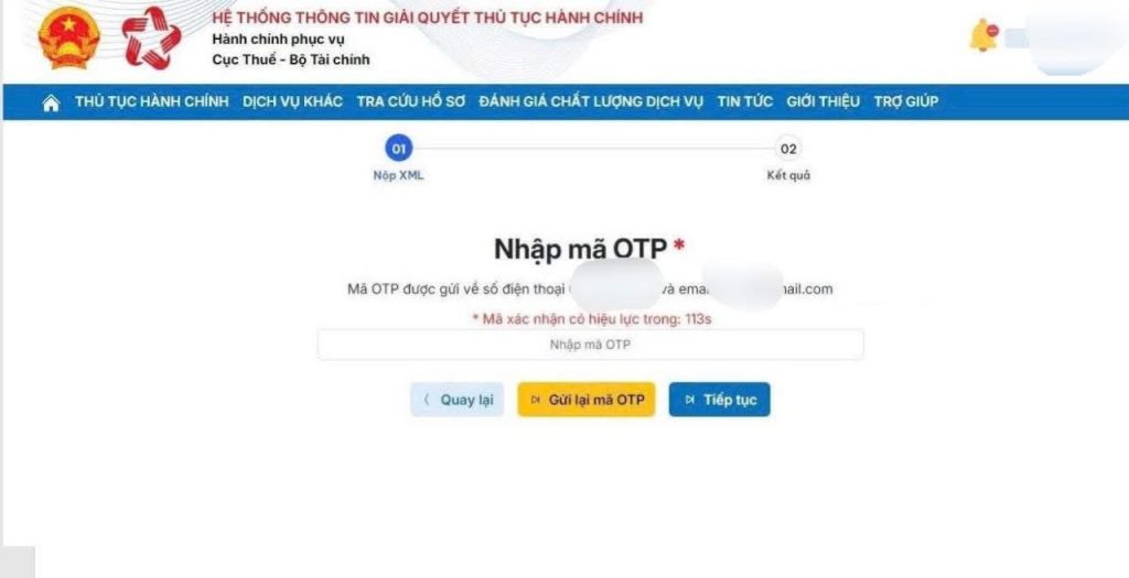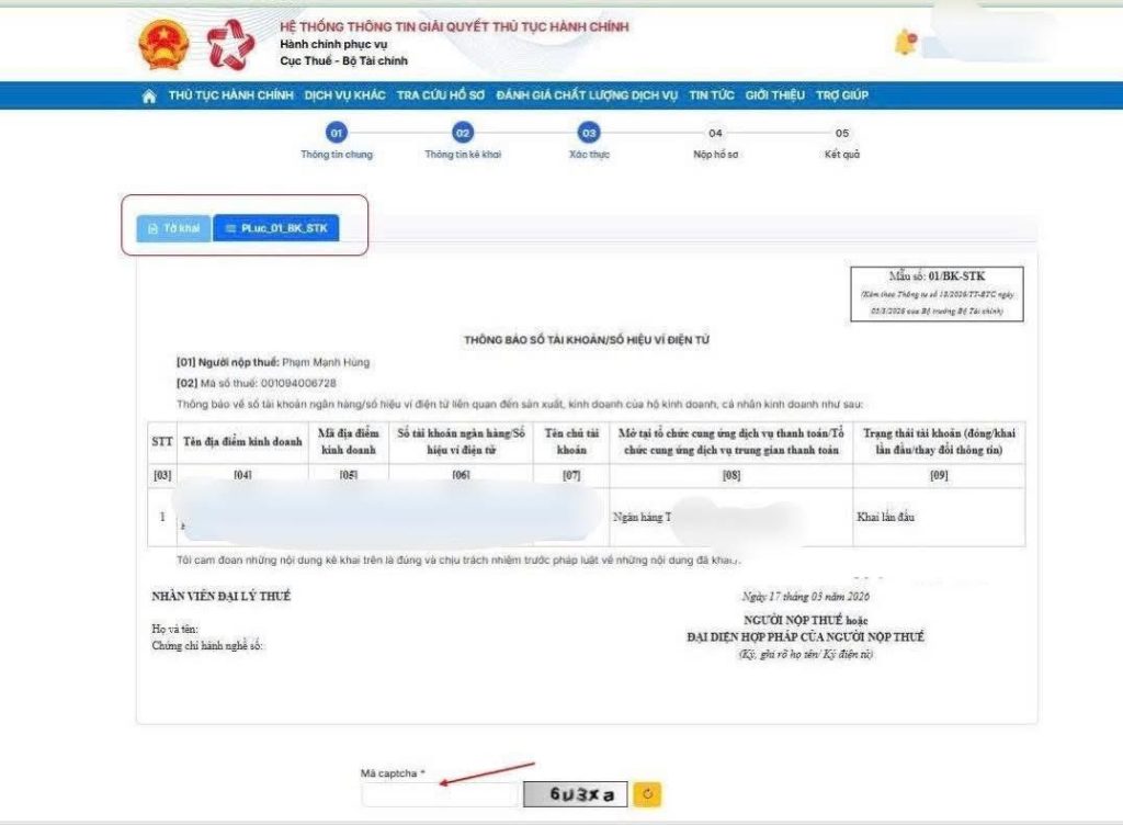 – B8: kiểm tra lại các thông tin tên, mã số thuế, địa chỉ và mức doanh thu đã kê khai -> “Tiếp tục” -> Hệ thống hiển thị tờ khai chính thức -> nhập mã Captcha -> “Tiếp tục” -> nhập mã OTP (được gửi về số điện thoại và email) => hoàn tất thủ tục nộp tờ khai