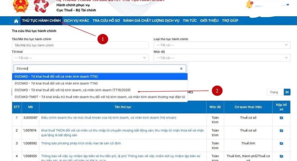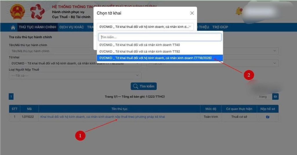 – B3: tại mục “Thủ tục hành chính” ->gõ tìm kiếm trong ô “Tờ khai” -> điền 01/CNKD theo TT18/2016 hoặc Tại ô “Tên/ Mã thủ tục hành chính” điền 1.011022 -> “Tìm kiếm”