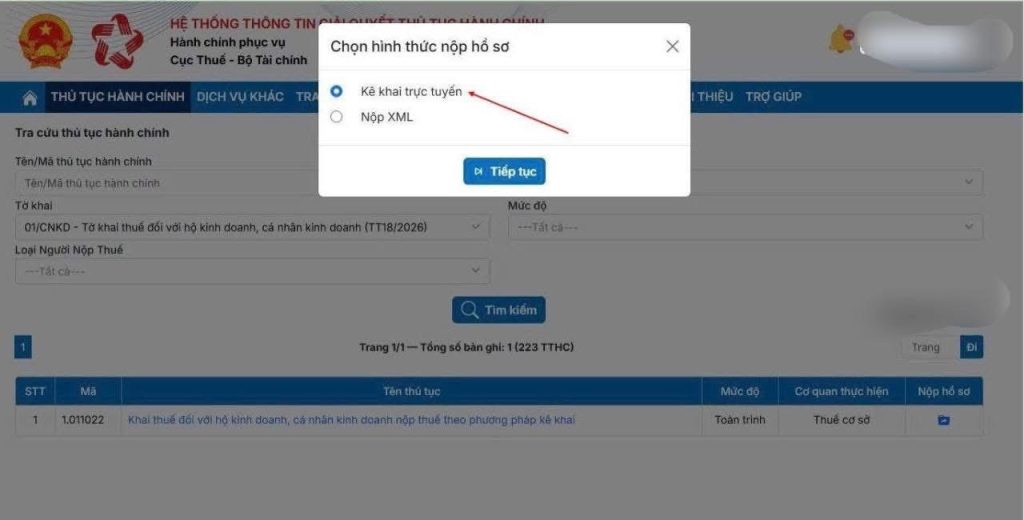 – B4: chọn loại tờ khai -> chọn mẫu 01/CNKD (TT18/2026) -> “Tiếp tục” -> “Kê khai trực tuyến”