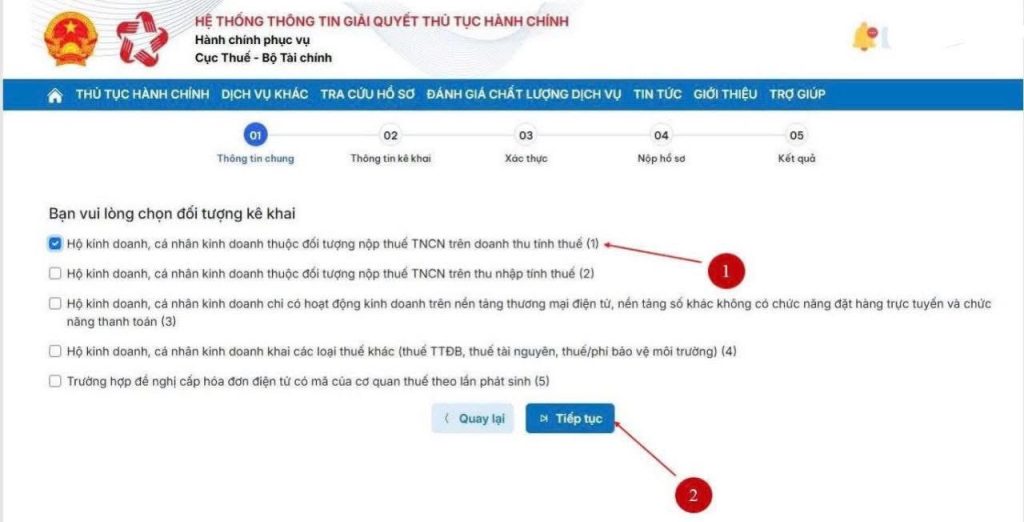 + nếu bạn thuộc đối tượng tính thuế TNCN theo doanh thu thì chọn (1)