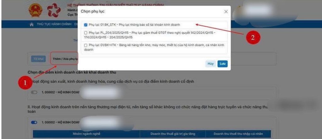 + nếu tính TNCN theo thu nhập thì chọn (2), Sau đó chọn thêm phụ lục 01BK_STK_ Phụ lục thông báo số tài khoản KD nếu chưa gửi TB này.