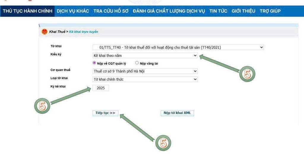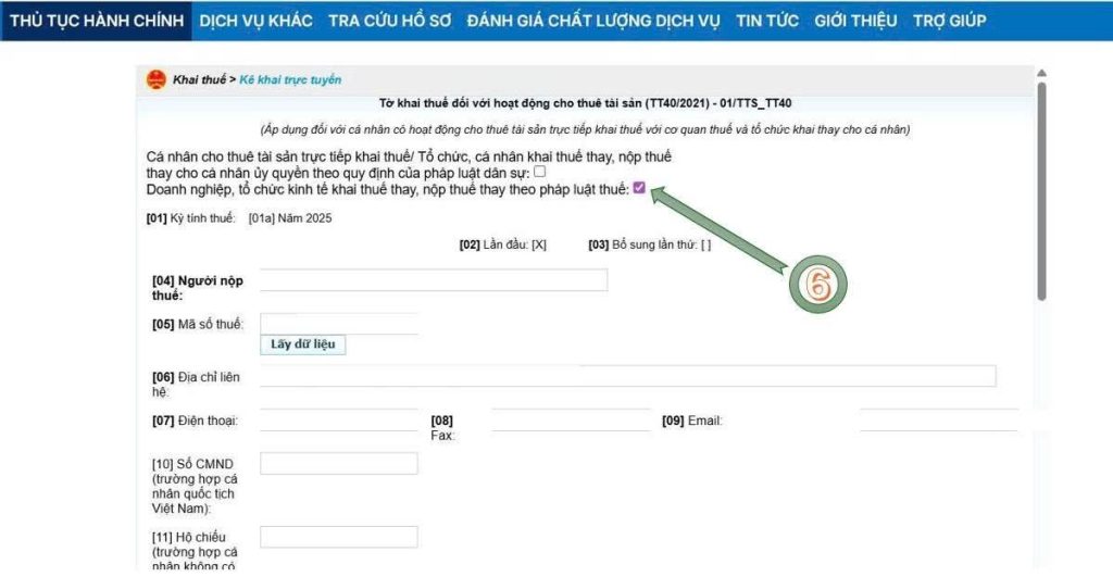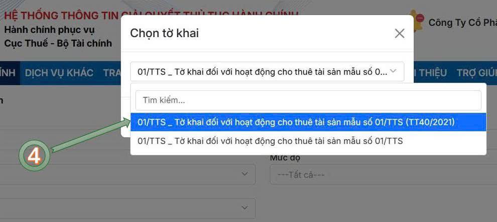 • Chọn 01/TTS – Tờ khai đối với hoạt động cho thuê tài sản (TT40).