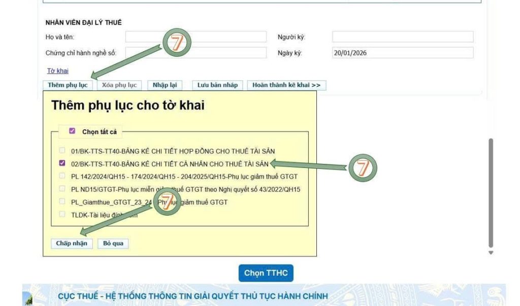 • Kéo xuống → Thêm phụ lục → chọn 02/BK-TTS-TT40 → Chấp nhận.