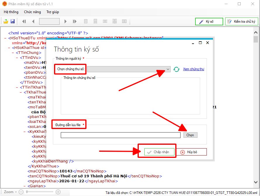 Bước 3: Bấm Ký Số –> trong bước ký số này lưu ý: chọn đúng Chữ ký số và xem thông tin chữ ký số còn hiệu lực hay không –> Chọn nơi lưu file XLM đã ký số offline