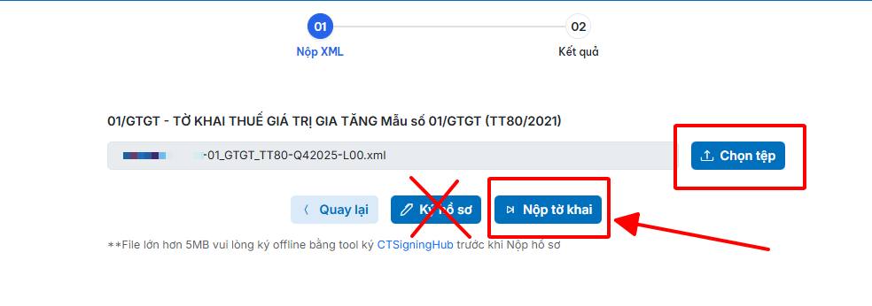 Bước 5: Sau khi chọn file XML đã ký offline lên bỏ qua bước ký số vì đã ký rồi –> Bấm nộp tờ khai luôn –>